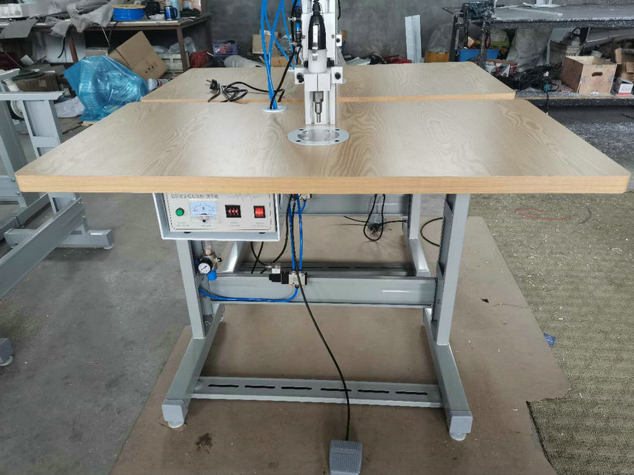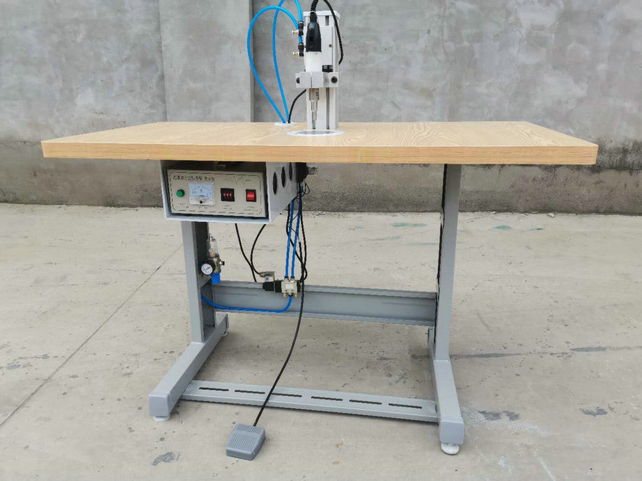 本機(jī)以超聲波將綁帶融合于口罩本體兩側(cè),進(jìn)而完成綁帶式口罩成品,只需一名操作員將口罩片置于超聲波發(fā)生器的頭上,后將綁帶放在口罩片上,腳踏踏板使氣缸向下運(yùn)動,縫住綁帶和口罩片。